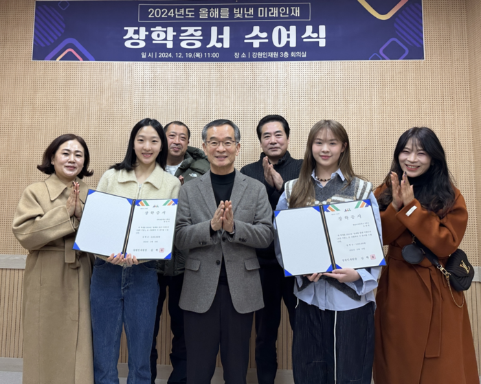 강원인재원은 12월 19일 ‘올해를 빛낸 미래인재’ 장학증서 수여식을 개최했다. 성취 부문에 배드민턴으로 세계와 국내를 종횡무진하며 활약을 펼친 치악고등학교 3학년 김민지(2019년 선발) 양과 보은 분야에 철원 출신의 한국무용 전공 김채린(2024년 선발) 양에게 1인당 300만 원의 특별 장학금을 지급했다.