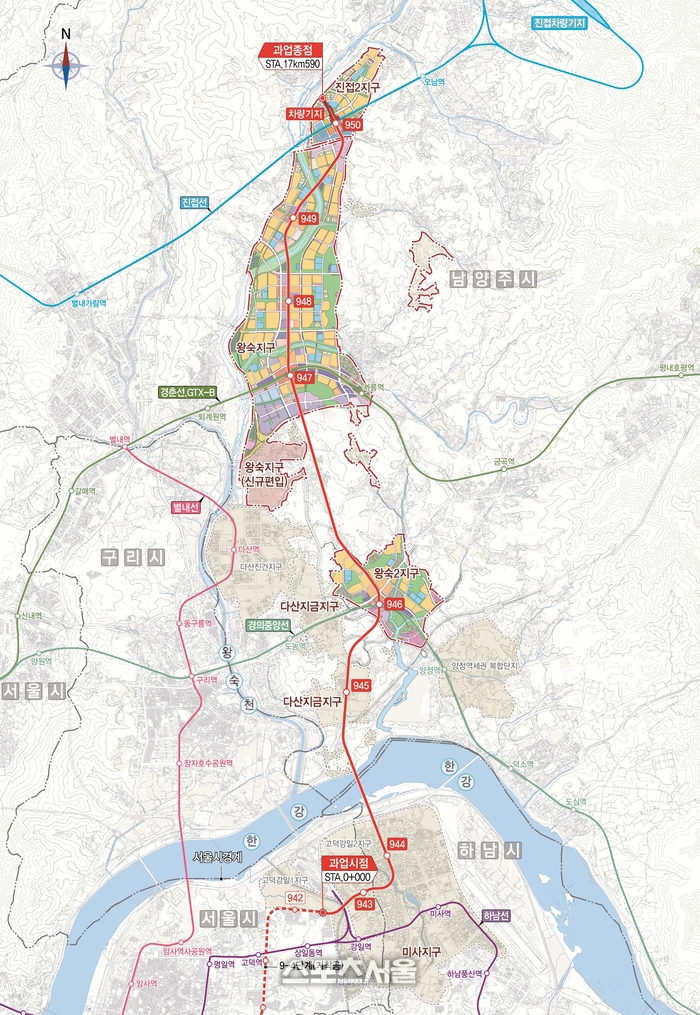 ‘강동하남남양주선 광역철도’는 3기 신도시 남양주 왕숙·왕숙2지구의 교통개선을 위한 사업이다. 서울도시철도 9호선 연장으로 서울 강동구에서 경기 하남시를 거쳐 남양주시 진접2지구까지 연장 17.59km, 정거장 8개소, 차량기지 1개소를 신설할 예정이다. 총사업비 2조 8,240억 규모의 철도 노선으로 2031년 개통을 목표로 추진 중이다.