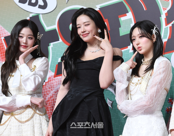 아이브 장원영, 안유진, 가을(왼쪽부터)가 25일 영종도 인스파이어 리조트 그랜드볼륨에서 열린 SBS 가요대전 레드카펫 행사에서 포즈를 취하고 있다.