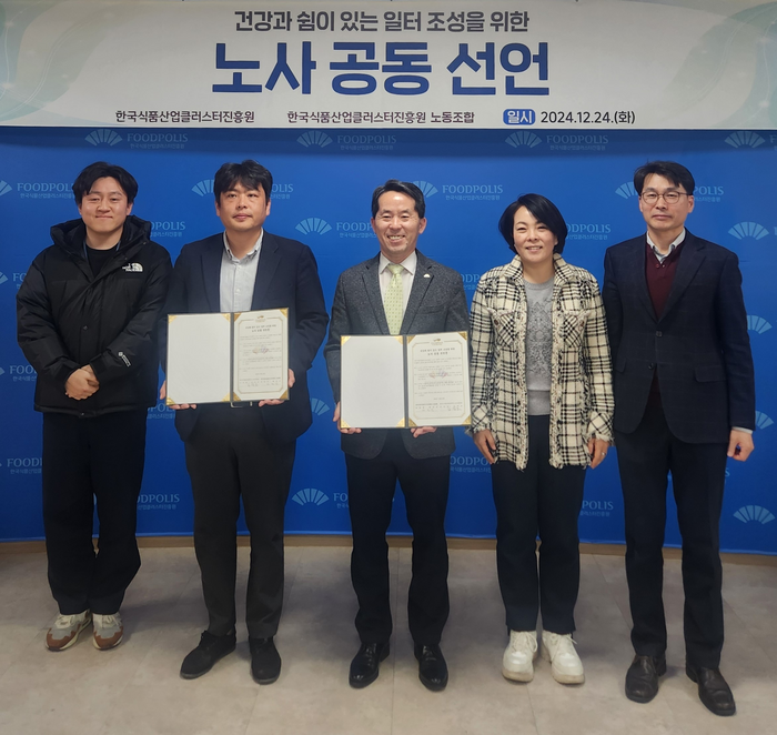 [스포츠서울ㅣ김기원기자]한국식품산업클러스터진흥원(이하 식품진흥원, 이사장 김덕호)이 26일, 식품진흥원노동조합(위원장 배정민)과 함께 ‘건강과 쉼이 있는 일터 조성을 위한 노사 공동 선언문’을 체결했다고 밝혔다.