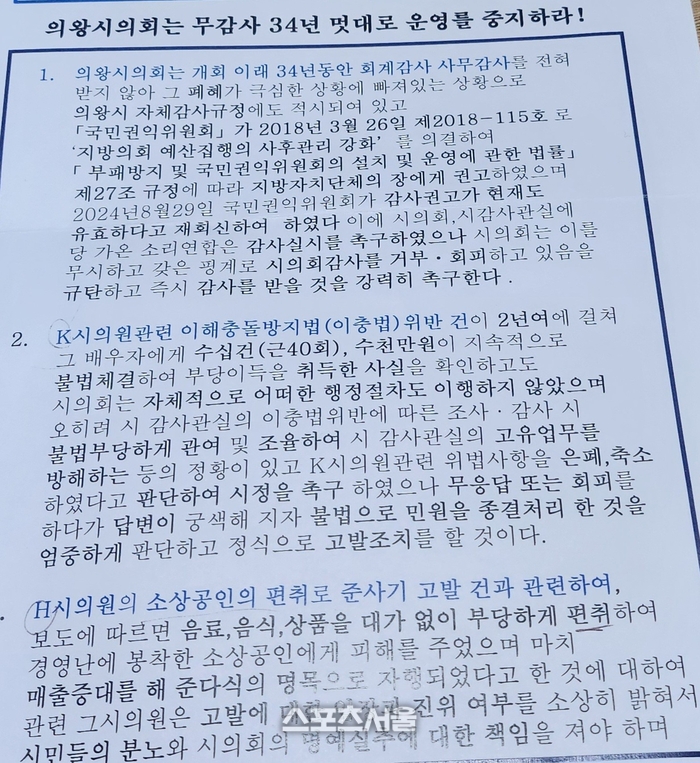 이에 앞서 과천,의왕,안양,군포를 중심으로 활동하고 있는 비영리법인 가온소리는 26일 시청 브리핑 룸에서 34년 동안 감사를 받지 않은 의왕시의회의 제 멋대로식 운영실태와 K의원이 자신의 배우자에게 2년여에 걸친 시와 의회 발주 현수막 불법체결에 따른 부당이득(이해충돌방지법 위반) , H의원에 힘없고 나약한 소상공인 편취에 따른 준사기 고발, 모 시의원이 시민들을 상대로한 고소 남발 등 도덕 불감증이 심각한 상태라고 지적했다.