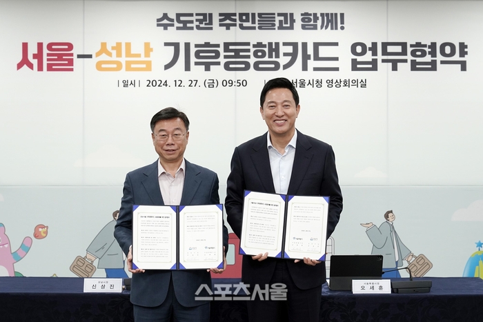 〔스포츠서울│성남=좌승훈기자〕신상진 성남시장은 27일 서울시청에서 오세훈 시장과 ‘성남시-서울시 기후동행카드 참여 업무협약’을 체결하고, 두 도시 간 대중교통 협력체계 강화를 논의했다.
