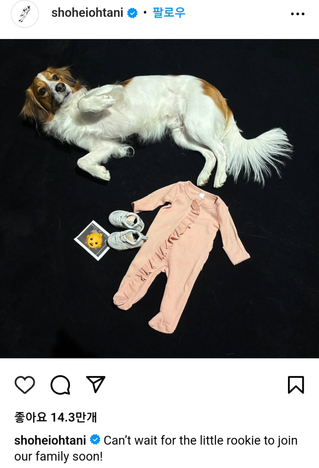 오타니는 SNS에 이모티콘으로 가린 태아 초음파 사진, 분홍색 아기 옷, 아기 신발, 반려견 데코핀을 찍은 사진을 올렸다. 그리고 “작은 루키가 우리 가족으로 곧 합류하길 기대하고 있다”고 적었다. 성별은 밝히지 않았다.