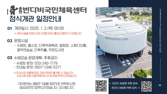 [스포츠서울ㅣ춘천=김기원기자]춘천도시공사(사장 홍영은)는 춘천반다비국민체육센터가 오는 2025년 1월 2일 오전 5시에 정식 개관한다고 밝혔다.