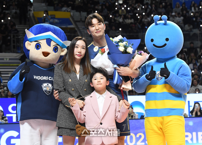 우리카드 최석기(오른쪽)가 31일 장충체육관에서 열린 2024-2025 V리그 한국전력과 경기 중 진행된 은퇴식에서 가족으로부터 꽃다발을 건네받고 기념촬영을 하고 있다. 2024. 12. 31.
