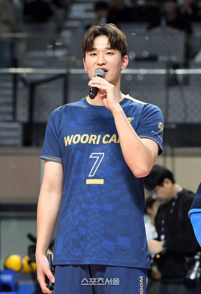 우리카드 최석기가 31일 장충체육관에서 열린 2024-2025 V리그 한국전력과 경기 중 진행된 은퇴식에서 소감을 밝히고 있다. 2024. 12. 31.