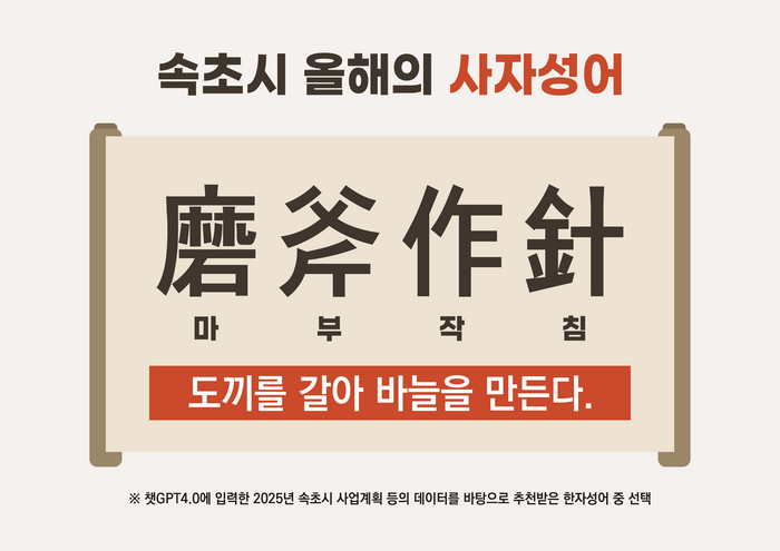 [스포츠서울ㅣ김기원기자]속초시는 2025년을 맞아 시정 운영의 지표가 될 한자성어로 ‘마부작침(磨斧作針)’을 선정했다.