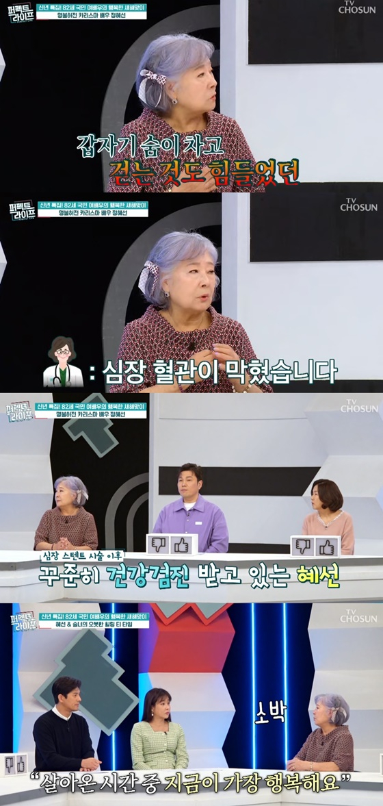 지난 1일 방송된 TV조선 예능 ‘퍼펙트 라이프’에 출연한 정혜선은 “2013년 드라마 지성이면 감천을 촬영하던 도중 심근경색이 발생했다. 어느 날 갑자기 숨이 차고 조금만 걸어도 힘들었다. 녹화 중에도 이상함을 느껴 다음 날 병원을 갔더니 혈관이 막혀 있었다”고 말했다.