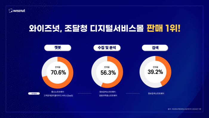 조달정보개방포털에서 각종 AI 솔루션의 연간 계약 실적을 비교한 결과, 와이즈넛은 지난해 기준 ▲AI 챗봇 솔루션(70.6%) ▲수집 및 분석 솔루션(56.3%) ▲검색 솔루션(39.2%) 등 모든 제품이 판매율 1위를 달성했다.