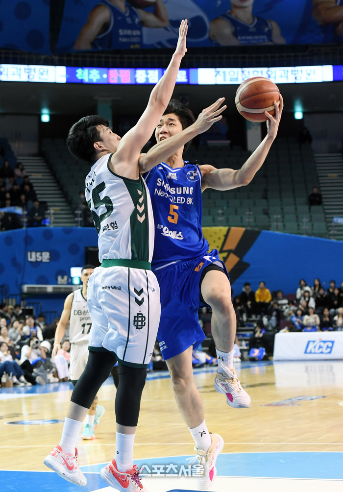 삼성 이원석(오른쪽)이 2일 잠실실내체육관에서 열린 2024-2025 프로농구 DB와 경기에서 DB 서민수의 수비를 피해 골밑슛을 하고 있다. 2025. 1. 2.