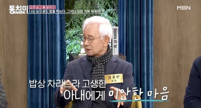 김홍신은 “제가 뭐라고 했냐면 ‘나는 눈으로도 밥을 먹는다’라고 했다. 아내 입장에서는 할 말이 없는 것”이라며 “입으로 먹는 게 아니라 눈으로도 먹는다고 하니 어떻게 하겠나. 지금까지도 반찬이 많아야 한다. 아내가 지금 살아있다면 꼭 사과할 일 중의 하나가 이것이라는 생각을 한다”고 지난 날에 대해 뼈저리게 사과했다.