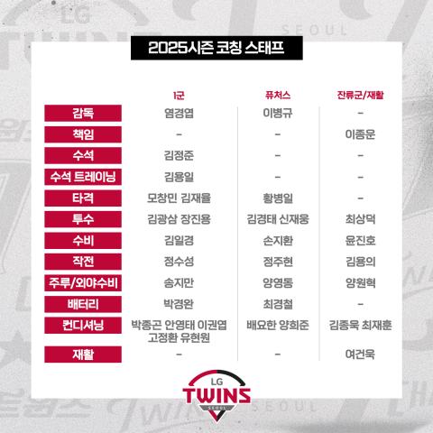 [스포츠서울 | 김동영 기자] LG가 3일 2025시즌 코치진 보직을 확정했다.