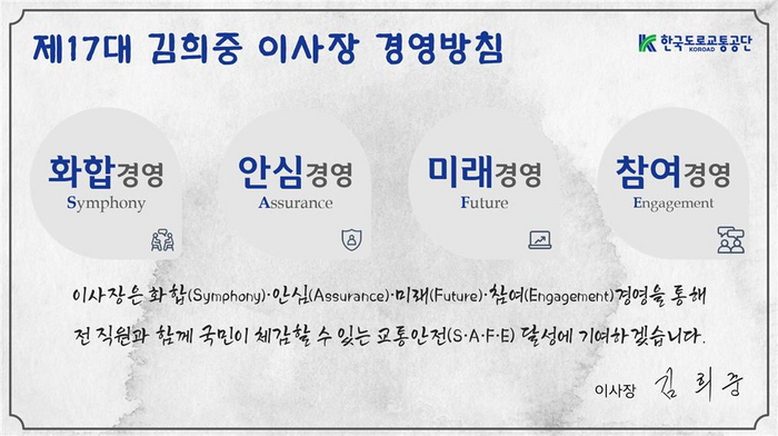 새로운 경영방침은 △화합(Symphony) : 배려와 양보틀 통한 긍정의 조직문화 구축 △안심(Assurance) : 안전을 넘어 국민이 안심할 수 있는 교통환경 제공, △미래(Future) : 업무프로세스 개선 및 신사업 발굴, △참여(Engagement) : 주인의식을 바탕으로 국민 참여 유도 등 4개 방침으로 구성되어 있다.