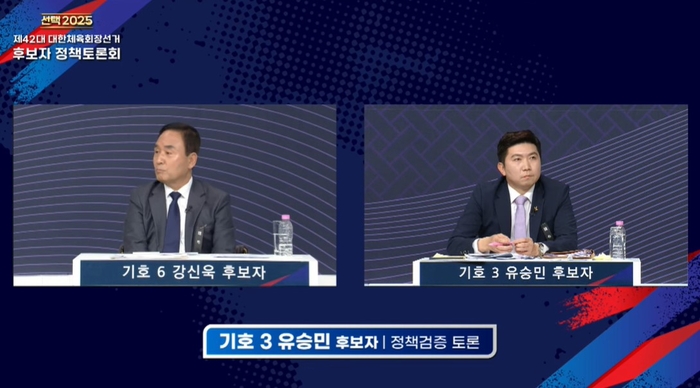 3선 연임 도전을 선언한 이기흥 후보를 견제하려는 나머지 후보의 날선 질문 뿐 아니라 유승민 후보 순서 때 강신욱 후보의 발언도 눈길을 끌었다. 강신욱 후보는 “유 후보께서 탁구협회장 재직 중 후원금을 받아 페이백, 국가대표 선발 선수 바꿔치기 의혹이 SNS에 돈 적이 있다”며 해명을 요구했다. 유승민 후보는 “내게 (선거에서) 질까봐 두려운 것 같다”며 미리 준비한 서류 봉투를 들어올렸다. 그는 “이게 다 (해당 의혹에 대해) 준비된 자료”라며 “탁구협회 재직 시절 100억원이 넘는 스폰서를 유치한 게 사실이다. 그런데 나 혼자가 아닌 탁구인이 염원을 담아 함께 노력했다. 근거없는 네거티브를 하실 줄 몰랐는데 난 충분히 답변할 준비가 돼 있다. 만약 근거가 없는 것이라면 강 후보도 도덕적 책임을 져야 할 것”이라고 했다.