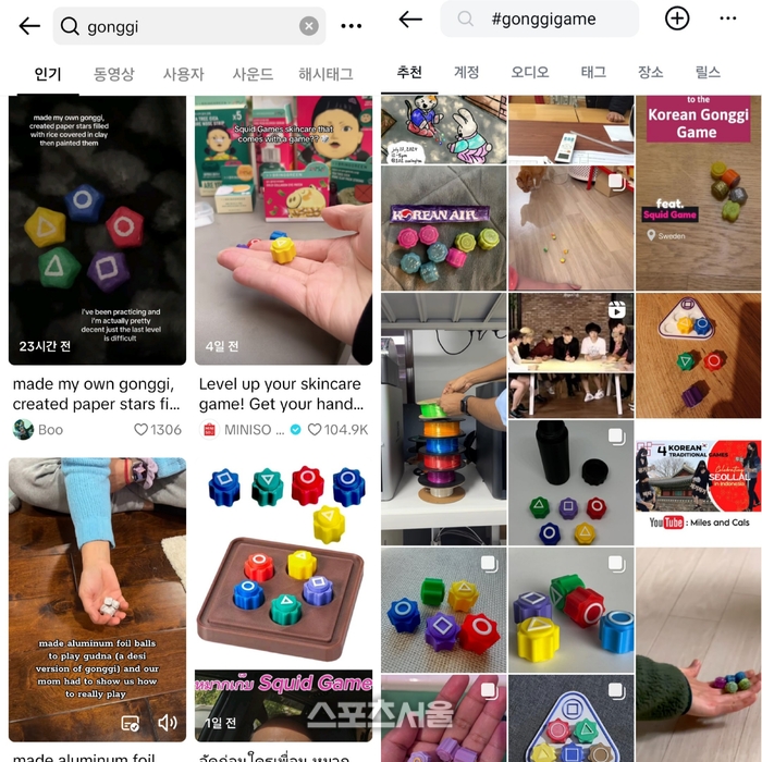 공기놀이 열풍이 불자 틱톡과 유튜브 등 SNS에서는 공기놀이 규칙을 소개하거나 다양한 아이템으로 공기놀이에 도전하는 영상이 잇따라 올라오고 있다. 실제 틱톡과 인스타그램에서 #gonggi, #squidgame 해시태그로 다수의 게시물이 공유되고 있다.