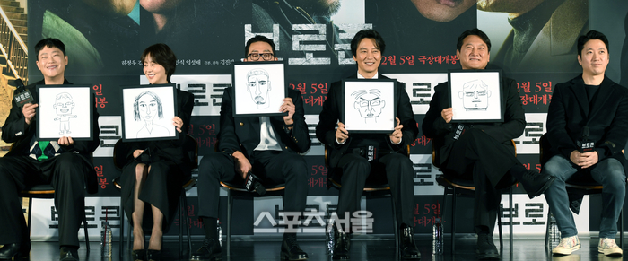 임성재, 유다인, 하정우, 김남길, 정만식(왼쪽부터)이 6일 롯데시네마 건대입구에서 열린 영화 ‘브로큰’ 제작보고회에서 몽타주를 들고 포즈를 취하고 있다.