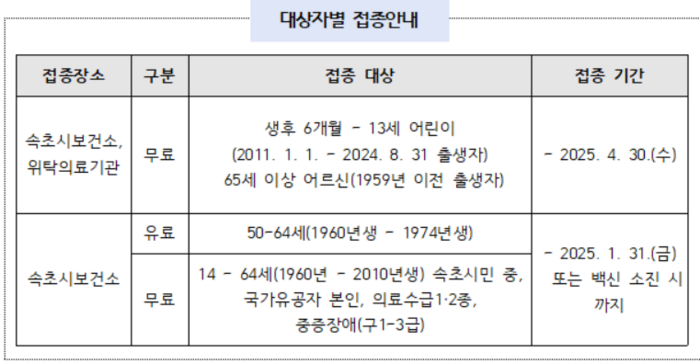 대상자별 지정 의료기관은 속초시보건소 및 예방접종 누리집에서 확인할 수 있으며, 자세한 문의사항은 속초시보건소(☏033-639-2921,3479)로 연락하면 된다.