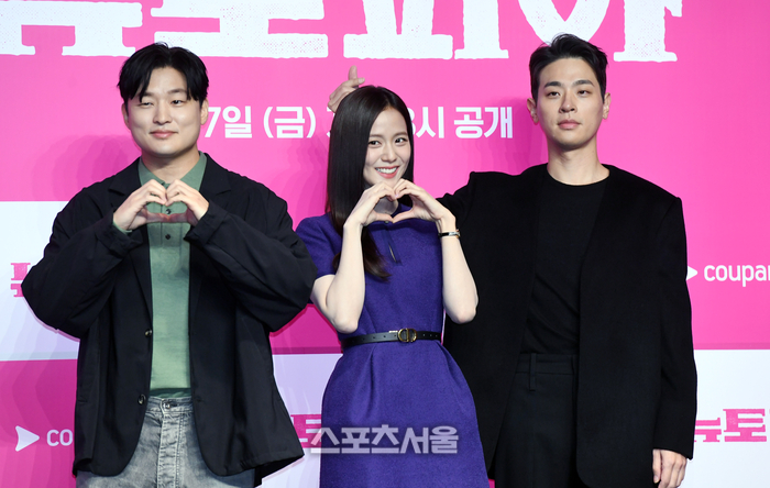 윤성현 감독(왼쪽부터), 배우 지수, 박정민이 7일 서울 영등포구 콘래드서울호텔에서 진행된 쿠팡플레이 시리즈 ‘뉴토피아’ 제작발표회에서 취재진을 향해 포즈를 취하고 있다.