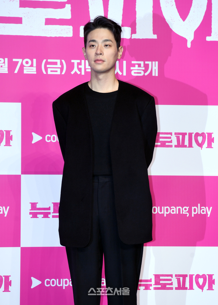 배우 박정민이 7일 서울 영등포구 콘래드서울호텔에서 진행된 쿠팡플레이 시리즈 ‘뉴토피아’ 제작발표회에서 취재진을 향해 포즈를 취하고 있다.