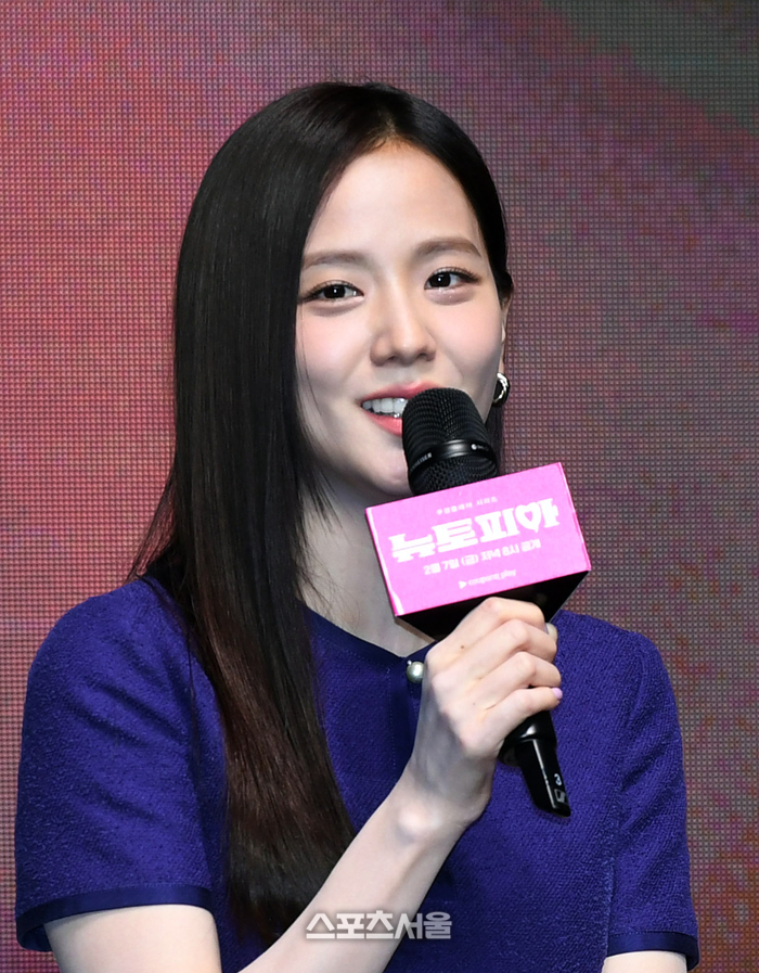 배우 지수가 7일 서울 영등포구 콘래드서울호텔에서 진행된 쿠팡플레이 시리즈 ‘뉴토피아’ 제작발표회에서 사회자의 질문에 답을 하고 있다.