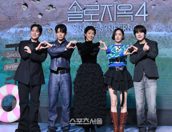 한해, 덱스, 홍진경, 이다희, 규현(왼쪽부터)dl 8일 호텔 나루 서울 엠갤러리에서 열린 넷플릭스 ‘솔로지옥4’ 제작발표회에서 포즈를 취하고 있다.