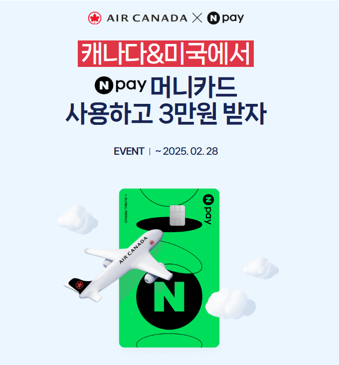 에어캐나다 공식 홈페이지의 신규 이주자 프로그램 페이지를 통해 네이버페이 선불카드인 ‘네이버페이 머니카드’를 발급받은 고객은 발급 후 3개월 내 캐나다와 미국에서 3만원 이상 결제시 네이버페이 포인트 3만 원을 적립 받는다.
