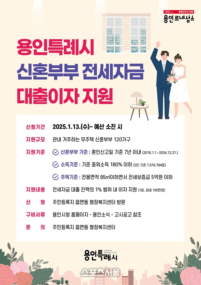 〔스포츠서울│용인=좌승훈기자〕경기 용인시는 결혼한 지 7년 이내 무주택 신혼부부의 주거 안정을 돕기 위해 최대 100만원의 전세자금 대출이자를 지원키로 하고 오는 13일부터 31일까지 총 120쌍을 모집한다고 9일 밝혔다.