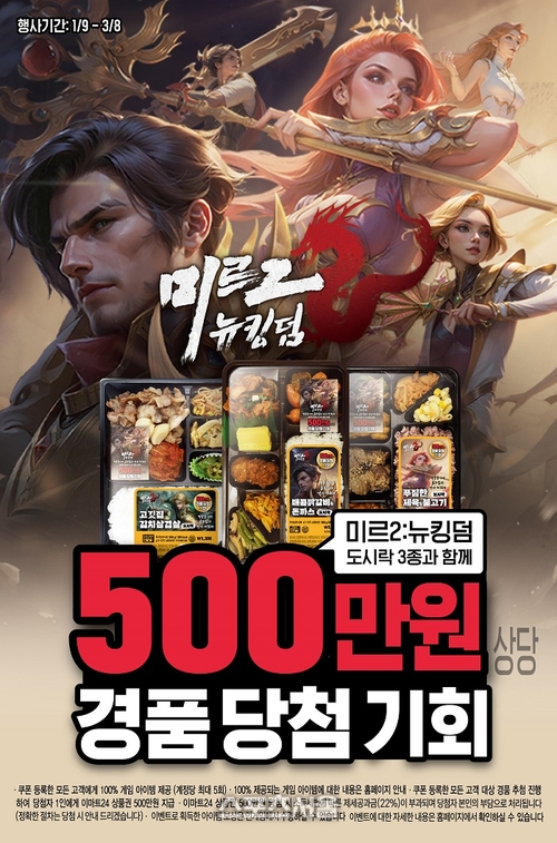 [스포츠서울 | 김종철 기자] 9RING은 자사가 서비스 예정인 모바일 RPG ‘미르2: 뉴킹덤’이 이마트24 편의점 도시락과 컬래버레이션을 진행한다고 9일 밝혔다.