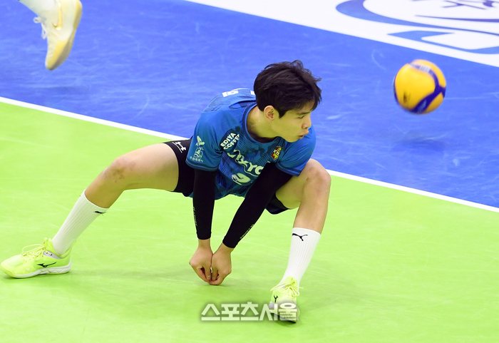 한국전력 리베로 김건희가 9일 수원체육관에서 열린 2024-2025 V리그 KB손해보험과 경기에서 아웃되는 상대 서브를 피하고 있다. 2025. 1. 9.