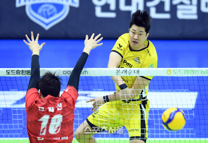 한국전력은 외국인 선수 마테우스가 복근 부상으로 이날 관중석에서 경기를 지켜봤다. 복근이 찢어진 건 아니지만, 무리하지 않겠다는 게 한국전력과 권영민 감독의 계획이다. 이를 대신해 아포짓으로 출격한 구교혁이 공격에서 좀처럼 활로를 만들지 못했다.