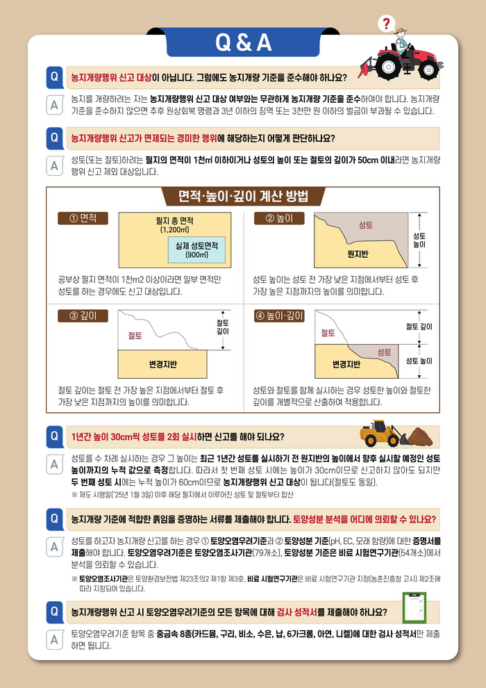 농지개량행위 전에 반드시 관계 부서에 신고해야 하며, 신고 시 농지개량행위 신고서, 사업계획서, 농지소유권 또는 사용권을 입증하는 서류와 농지개량 기준에 적합한 흙임을 증명하는 분석성적서, 피해방지계획서 등을 제출해야 한다.