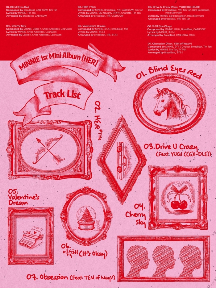 선공개된 앨범 수록곡 ‘Blind Eyes Red’를 시작으로, (여자)아이들 우기가 피처링한 ‘Drive U Crazy’와 WayV 텐이 참여한 ‘Obsession’까지 글로벌 팬들의 기대를 모으는 곡들이 포함됐다. 두 아티스트의 개성 넘치는 음색과 민니의 독창적인 보컬이 만들어낼 시너지는 앨범의 또 다른 감상 포인트다.