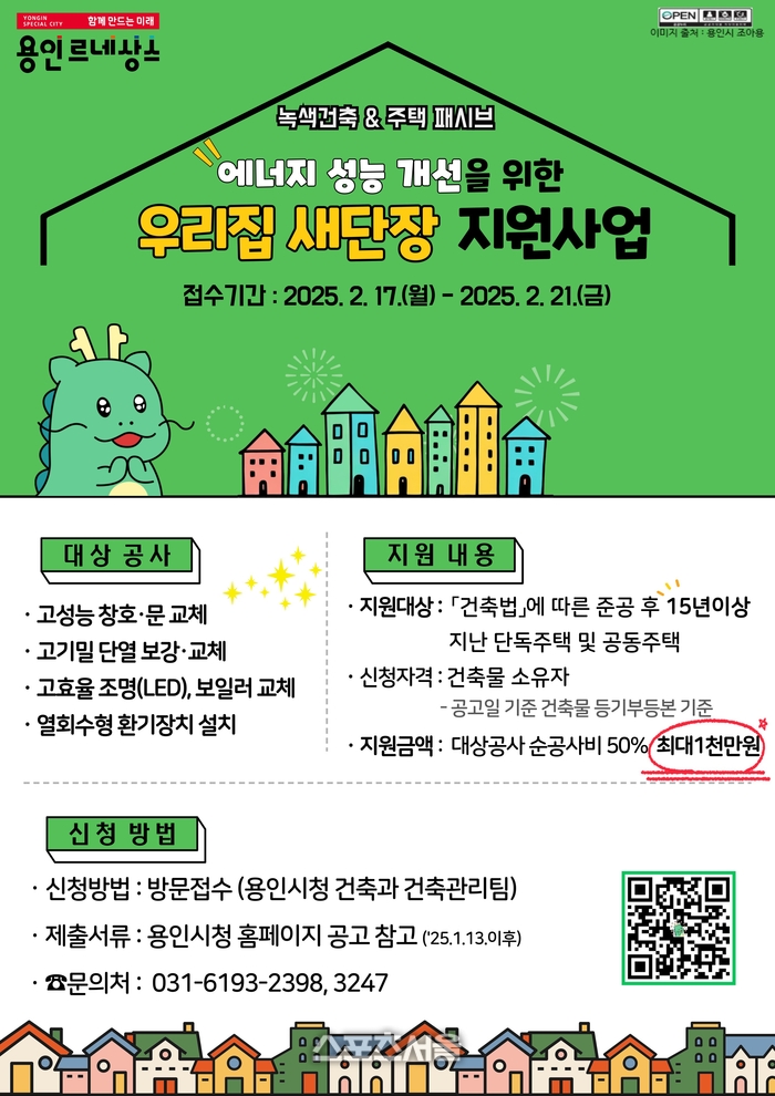 시 관계자는 “노후 건축물의 에너지 성능을 개선해 쾌적한 주거 환경을 조성하도록 돕기 위해 올해부터 ‘우리집 새단장 지원사업’을 시행한다”며 “전년보다 지원 규모를 늘린 만큼 기준에 부합하는 시민이 많이 신청해 주거 환경 개선에 실질적 도움을 얻기 바란다‘고 말했다.