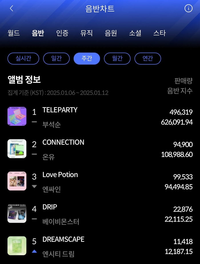 특히 부석순은 주간 음반차트에서도 1위를 차지했다. 부석순의 두 번째 싱글 ‘TELEPARTY’는 1월 2주 음반 지수 62만6091.94점(판매량 49만6319장)을 기록하며 뜨거운 반응을 얻었다. 이어 2위는 온유의 미니 4집 ‘CONNECTION’으로 음반 지수 10만8988.60점(판매량 9만4900장)을 기록했으며, 3위는 엔싸인의 미니 3집 ‘Love Potion’이 음반 지수 9만4494.85점(판매량 9만9533장)으로 뒤를 이었다.