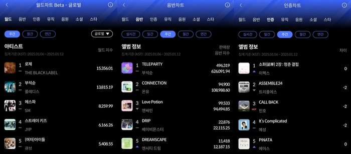 한터차트의 1월 2주 차 집계 기간은 6일부터 12일까지로, 월드차트는 음반, 음원, 인증, SNS, 미디어 등 다양한 글로벌 데이터를 바탕으로 순위를 산정했다. 음반차트는 전 세계 음반 판매량을 기반으로 한 음반 지수를 기준으로 하며, 인증차트는 해외 팬들의 정품 음반 인증량을 기준으로 발표된다.