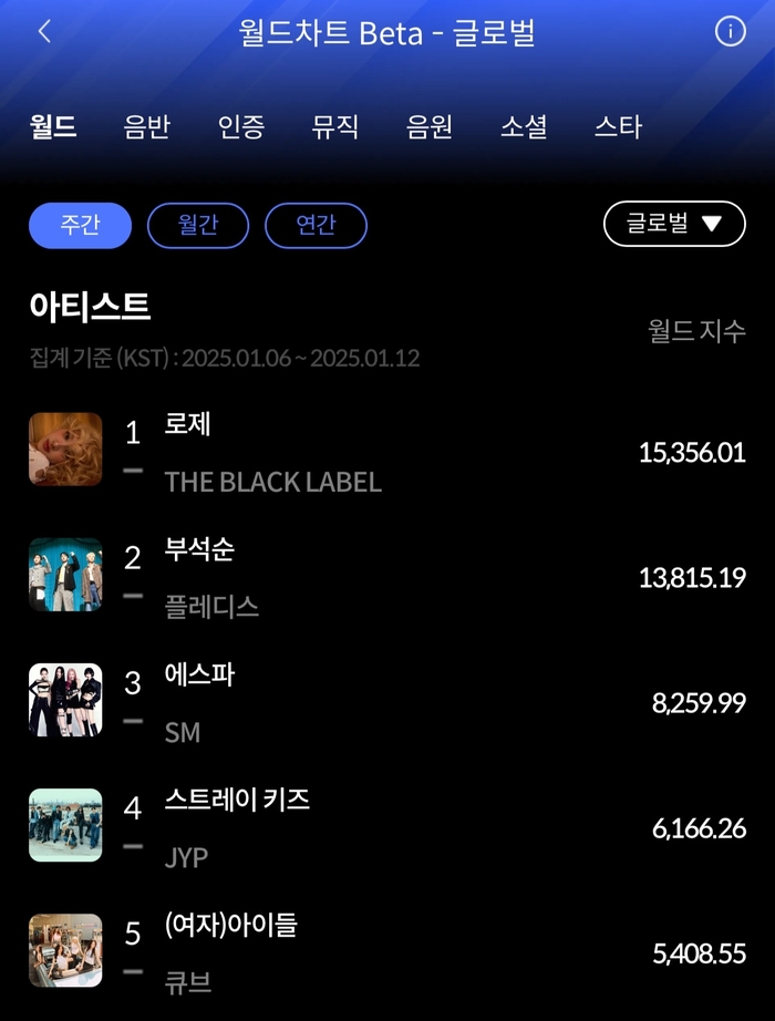 세계 유일의 실시간 음악차트인 한터차트는 13일 오전 10시, 1월 2주 차 주간차트를 발표했다. 로제는 주간 월드차트 1위를 차지하며 독보적인 글로벌 파워를 입증했다. 그는 음원, 소셜, 미디어 부문에서 높은 점수를 기록하며 월드 지수 1만5356.01점을 기록, 정상에 올랐다. 이어 부석순이 월드 지수 1만3815.19점으로 2위, 에스파가 월드 지수 8259.99점으로 3위를 차지했다.