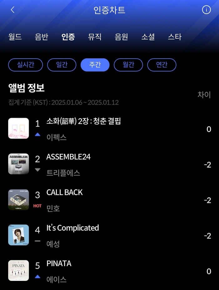 한편, 이펙스는 주간 인증차트 1위에 오르며 해외 팬들의 뜨거운 사랑을 증명했다. 이펙스의 정규 2집 ‘소화(韶華) 2장 : 청춘 결핍’은 대만 지역에서 가장 높은 인증률을 기록하며 1위를 차지했다. 2위는 트리플에스의 정규 1집 ‘ASSEMBLE24’, 3위는 민호의 정규 1집 ‘CALL BACK’이 이름을 올렸다.