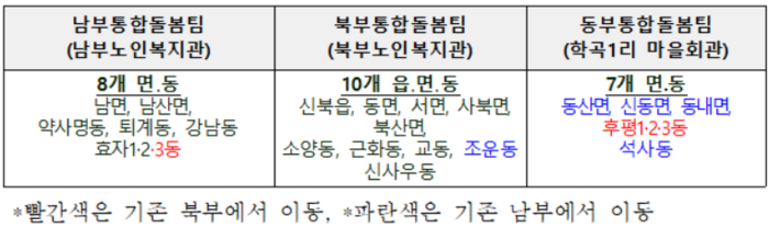 또한, 민원인, 수행기관, 행정복지센터 업무의 효율을 높이고자 기존 2개 남부·북부 통합돌봄팀이 담당하는 읍면동 중 효자 1,2,3동과 후평 1,2,3동을 통합해 권역을 조정했다.