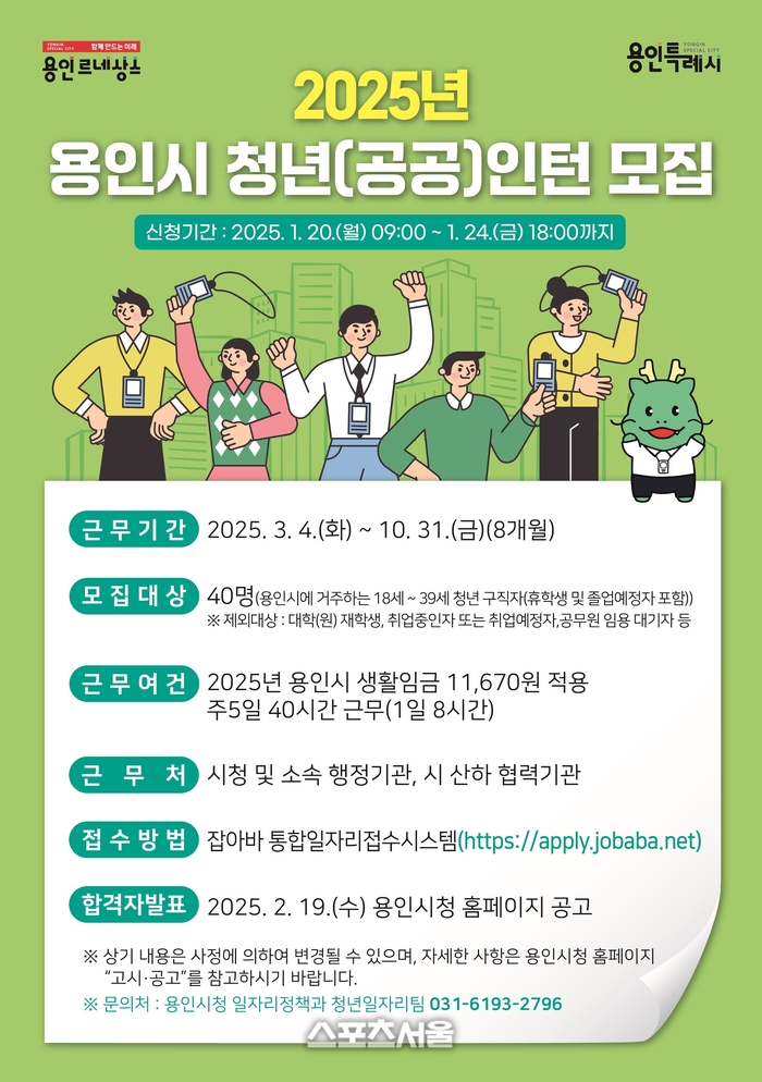 〔스포츠서울│용인=좌승훈기자〕경기 용인시는 오는 20일부터 24일까지 5일간 시청 등 공공기관에서 사무보조 업무를 하며 공공분야 경력을 쌓을 청년인턴 40명을 모집한다고 15일 밝혔다.