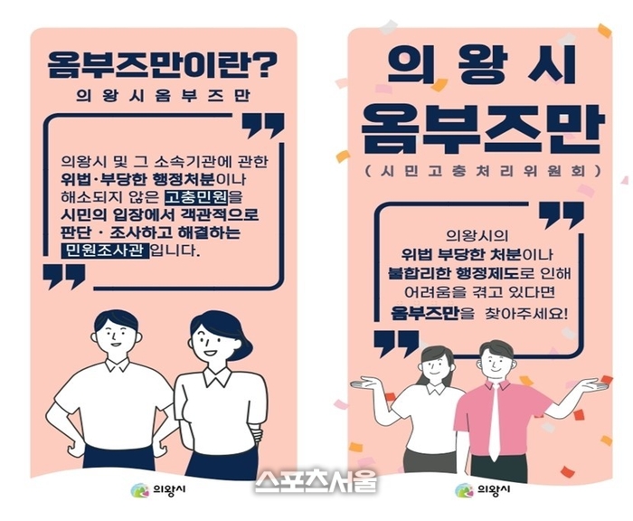 〔스포츠서울│의왕=좌승훈기자〕경기 의왕시는 시민이 겪는 행정상의 고충을 공정하게 해결하기 위해 ‘옴부즈만(시민고충처리위원회)’ 제도를 운영 중이라고 15일 밝혔다.
