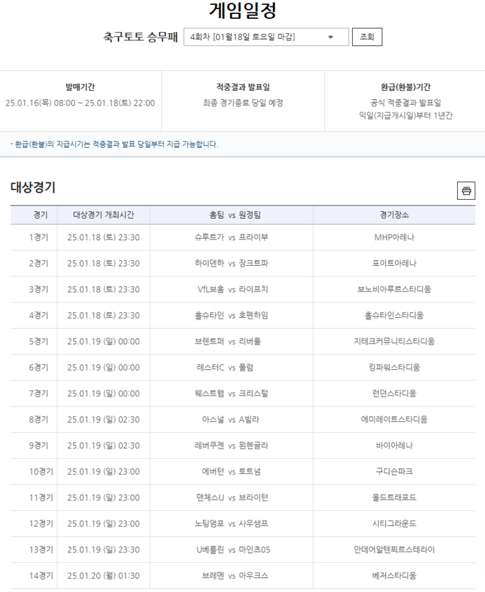 [스포츠서울 | 최규리 기자] 국민체육진흥공단이 발행하는 체육진흥투표권 스포츠토토의 수탁사업자 스포츠토토코리아가 오는 1월 18일부터 20일까지 열리는 잉글랜드 프리미어리그(EPL) 7경기 및 독일 분데스리가 7경기 등 총 14경기를 대상으로 하는 축구토토 승무패 4회차 게임을 발매한다고 밝혔다.