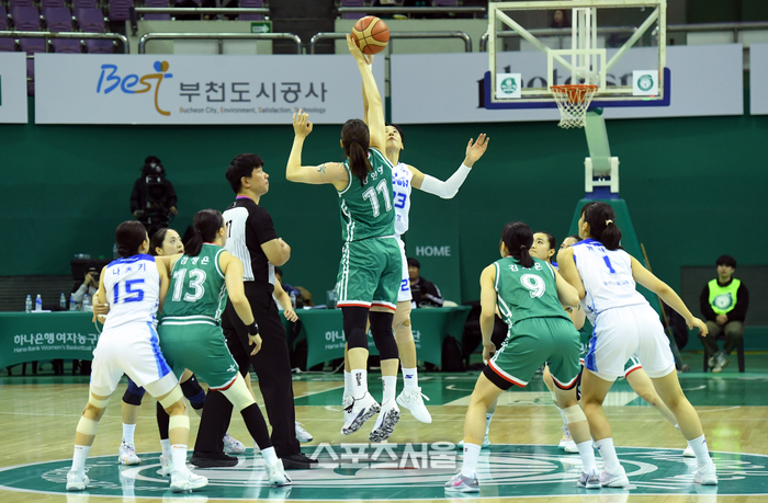 15일 부천체육관에서 열린 2024-2025 여자프로농구 하나은행과 우리은행의 경기에서 하나은행 양인영(왼쪽)과 우리은행 김단비가 점프볼을 하고 있다. 2025. 1. 15.