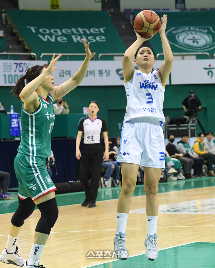 우리은행 한엄지(오른쪽)가 15일 부천체육관에서 열린 2024-2025 여자프로농구 하나은행과 경기에서 하나은행 양인영의 수비를 피해 슛을 하고 있다. 2025. 1. 15.
