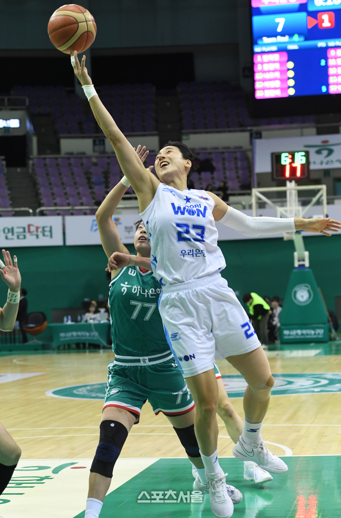 우리은행 김단비(오른쪽)가 15일 부천체육관에서 열린 2024-2025 여자프로농구 하나은행과 경기에서 하나은행 박소희의 수비를 피해 레이업슛을 하고 있다. 2025. 1. 15.