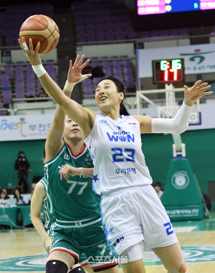 우리은행 김단비(오른쪽)가 15일 부천체육관에서 열린 2024-2025 여자프로농구 하나은행과 경기에서 하나은행 박소희의 수비를 피해 레이업슛을 하고 있다. 2025. 1. 15.