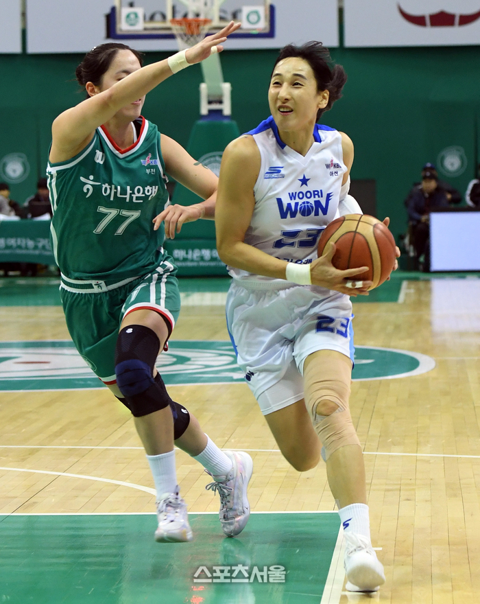 우리은행 김단비(오른쪽)가 15일 부천체육관에서 열린 2024-2025 여자프로농구 하나은행과 경기에서 하나은행 박소희의 수비를 피해 레이업슛을 하고 있다. 2025. 1. 15.