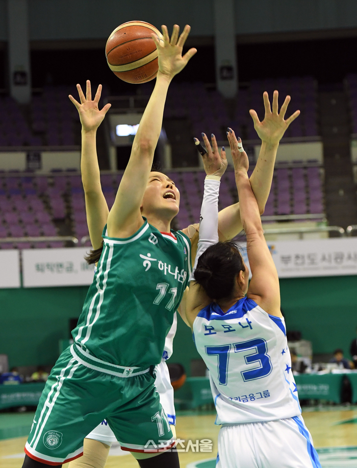 하나은행 양인영(왼쪽)이 15일 부천체육관에서 열린 2024-2025 여자프로농구 우리은행과 경기에서 우리은행 모모나의 파울에 공을 놓치고 있다. 2025. 1. 15.
