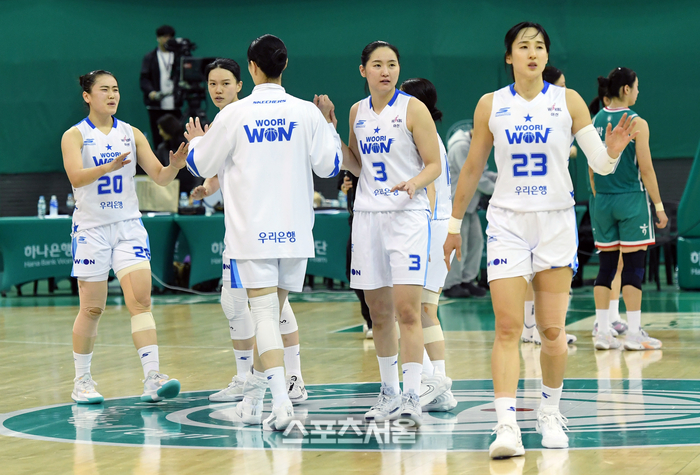 우리은행 선수들이 15일 부천체육관에서 열린 2024-2025 여자프로농구 하나은행과 경기에서 43-38로 역전승을 한 뒤 하이파이브를 나누고 있다. 2025. 1. 15.
