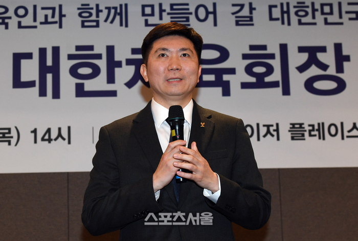 제42대 대한체육회장에 당선된 유승민 전 IOC위원이 16일 서울 중구 프레이저 플레이스 호텔에서 진행된 당선 기자회견에서 인사말을 하고 있다.