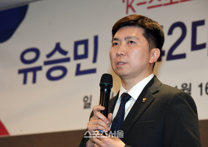제42대 대한체육회장에 당선된 유승민 전 IOC위원이 16일 서울 중구 프레이저 플레이스 호텔에서 진행된 당선 기자회견에서 인사말을 하고 있다.